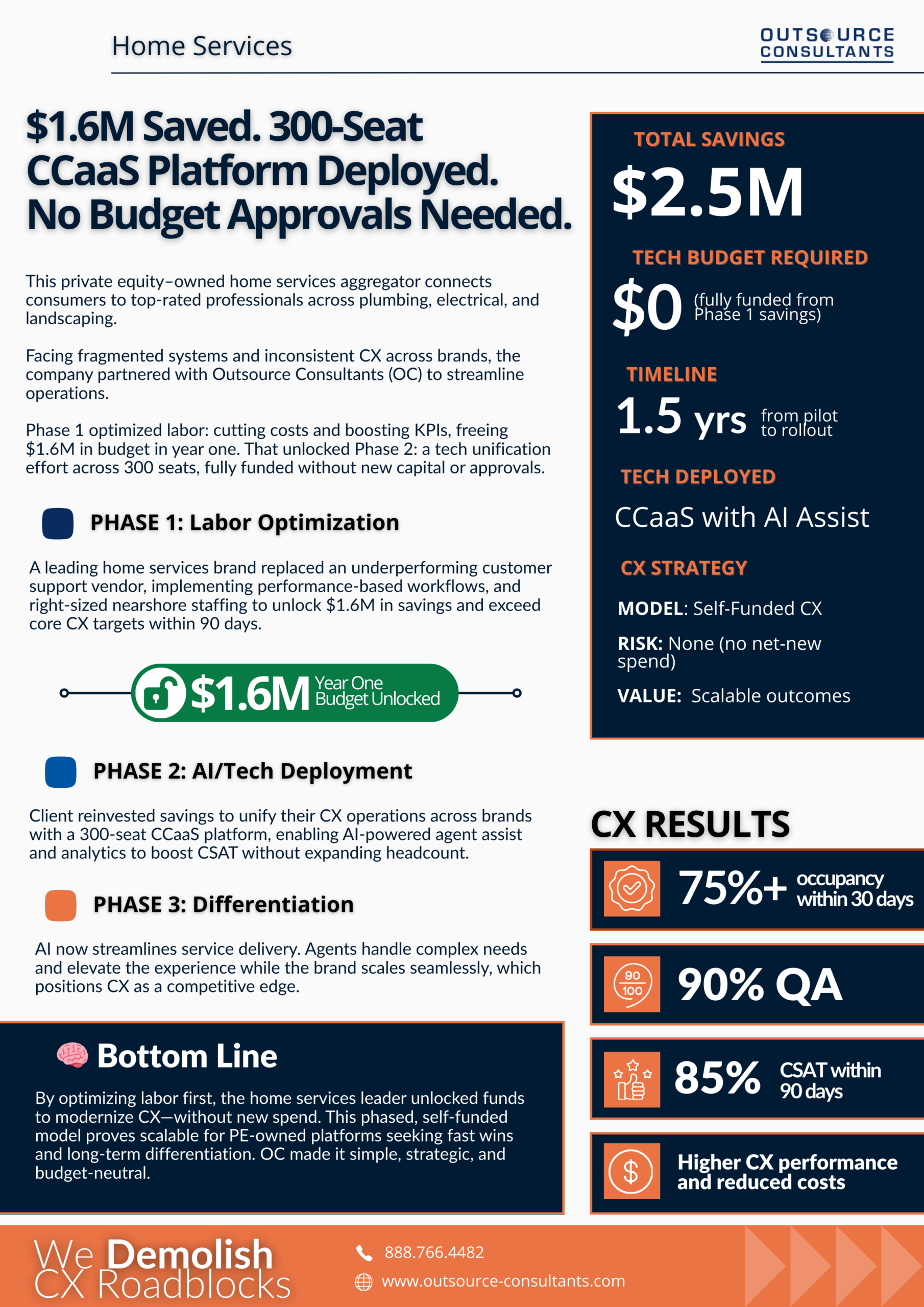 Within 90 days of Phase 1, the client exceeded core CX performance targets while unlocking $1.6M in year-one savings. Occupancy exceeded 75% within 30 days, QA reached 90%, and CSAT reached 85% within 90 days.