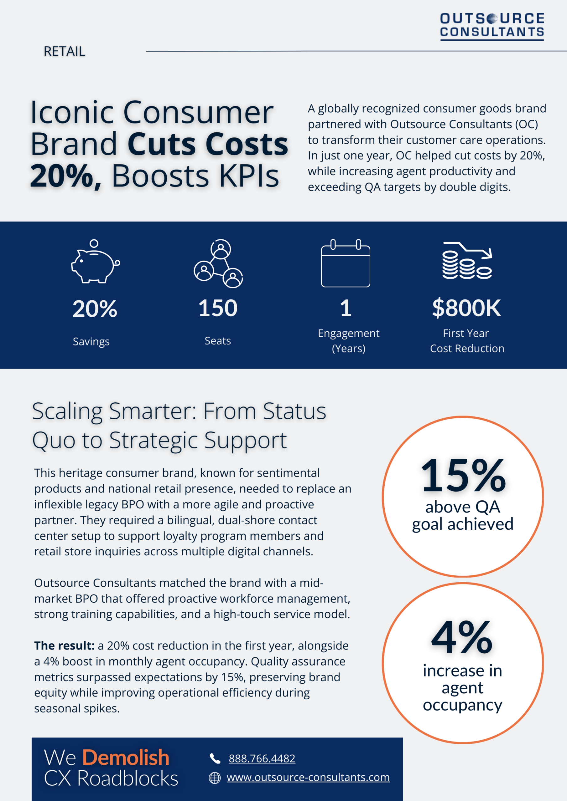 Agent productivity increased, with monthly occupancy improving by 4%. Quality assurance performance exceeded established targets by 15%, supporting consistent service delivery while maintaining the brand’s customer experience expectations during periods of fluctuating demand.